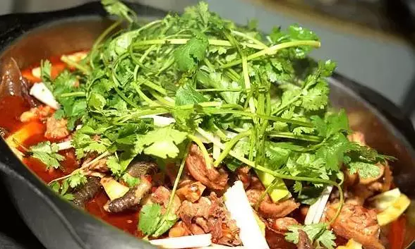 3.凈鍋放菜油燒熱,下入火鍋底料、姜米和蒜米炒香,摻適量的清水燒沸后,調入鹽、味精和雞精,放入鳳尾、豆芽、苕粉、蒜苗段煮斷生,撈入窩盤里墊底,再倒入燒熟的五花肉塊。大火收汁入味后,用水淀粉勾二流芡,然后裝在窩盤內,并撒入刀口辣椒,最后澆上燒得滾燙的熱油激香,即成。